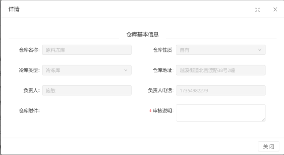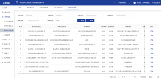 显示本账号辖区内所有经营企业的仓库信息,包括自有仓库、租赁仓库以及委托仓库。可以通过企业名称、仓库名称、仓库性质、冷库类型、仓库负责人、审核类型来查询。每家企业的每条仓库信息都是分开记录的。
