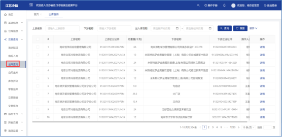 出库查询可以查询所有的出库操作记录。并可以根据食品来源、检验检疫证编号、出入库日期、原产国、入境口岸、上下游企业证件、上游名称、下游企业编号等条件进行搜索。
