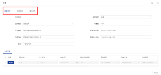 点击最右侧【详情】按钮查看出库详情,包括基本信息、进口信息和操作信息。