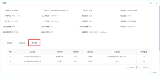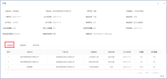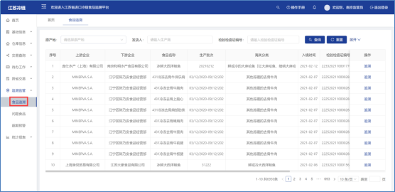 食品溯源列表可以查看企业所有食品的入关信息和批次信息等,追溯详情里还可以看到该食品每一笔出入库信息,以及详细的产品信息和企业信息。同时每一笔出入库操作都记录在案,包括上下游企业、交易类型、食品来源、出入库日期以及重量等。还可以看到企业剩余库存信息。在查询条件中可以根据食品来源、检验检疫证编号、出入库日期、原产国、入境口岸、上下游企业证件、上游名称、下游企业编号入境起止日期等条件进行搜索。