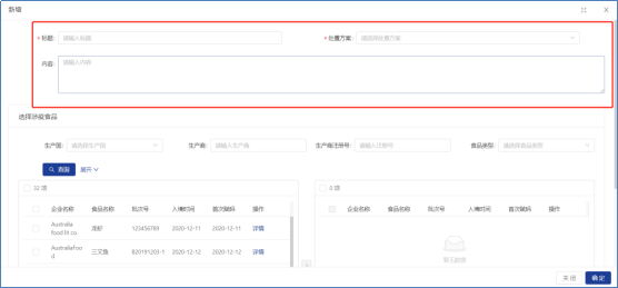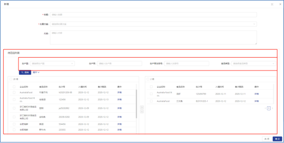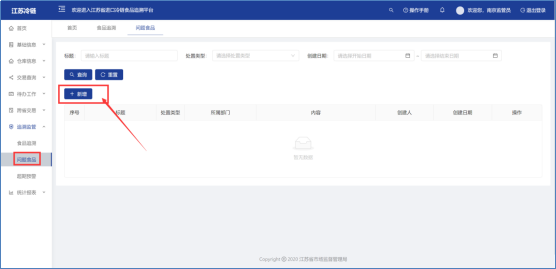 问题食品处置功能主要在食品产生问题时,可以在所有的首站赋码入库记录中将问题产品选中,系统自动查询出与之相关的所以流转信息并全部冻结操作,方便追溯防范。可根据处置类型、创建日期来查询。点击页面左上角的新增按钮录入问题食品信息。