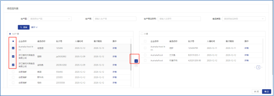 对问题产品进行初步筛选后勾选左侧复选框选定涉疫产品,点击页面中间的右向箭头,将产品列入系统右侧页面。选定完成后点击下方确定按钮完成问题产品添加。