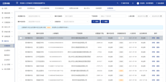 显示本账号辖区内各企业的集中仓交易记录信息,集中仓入库信息即首站赋码信息。可以根据来源集中仓、集中仓编号、下游名称、入库日期、集中仓状态、冷链状态来查询。