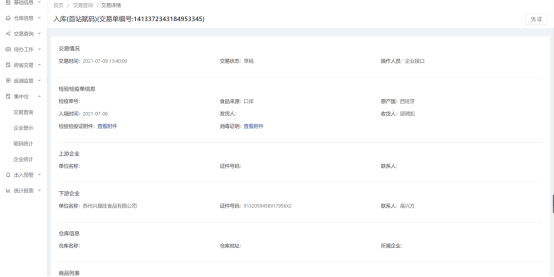 点击【详情】按钮,可以查看交易详细记录,包括交易情况、检验检疫单信息、上游企业、下游企业信息、商品列表以及交易备注信息。