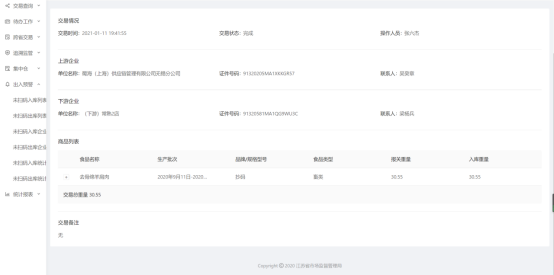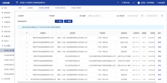 统计辖区内所有上游企业已批次出库,但下游企业还未扫码入库的交易单信息。可以通过上游名称、下游名称、部门选择、出入库日期、检验检疫证号来查询。