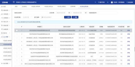 统计本辖区内所有企业已扫码入库,但长期未进行任何出库操作的交易单信息。可以根据当前企业名称、入库日期、检验检疫证号、未出库天数、部门选择来查询。