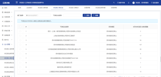 统计本辖区所有上游企业已批发出库3天后,下游企业仍未进行扫码入库操作的企业信息。可以根据部门选择、下游企业名称来查询。