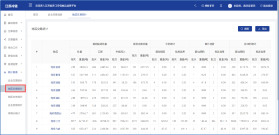 展示本市各个区的交易信息,包括首站赋码总量、批发出库总量、今日统计、昨日统计以及近30日统计数据。