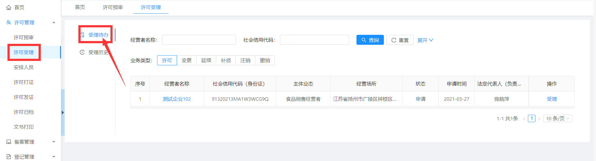 点击菜单【许可受理】-【受理待办】显示本辖区企业上报的许可申请信息。