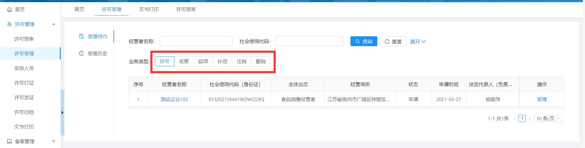 5.不同业务的许可申请,受理人员切换页签即可查看对应待受理信息。