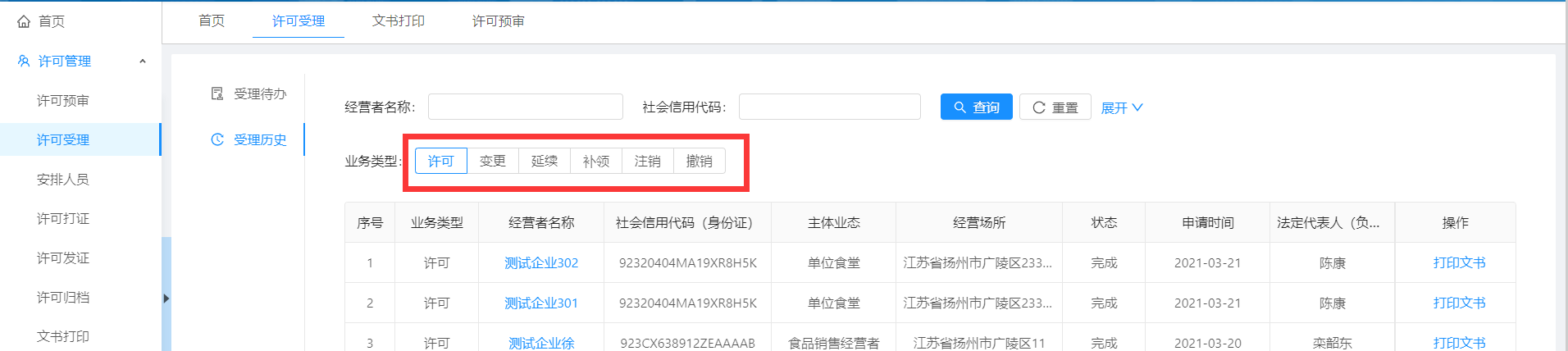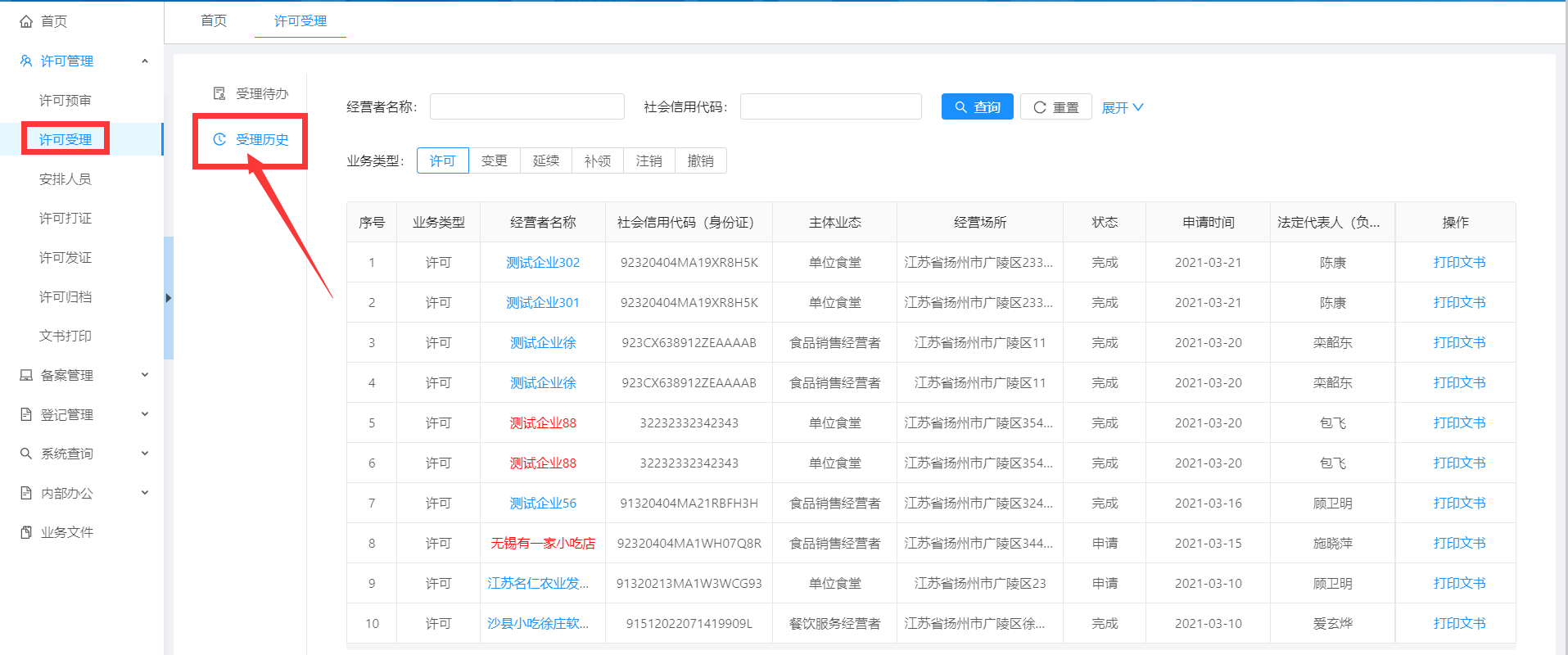 点击菜单【许可受理】-【受理历史】,可以看到所有自己许可受理过的企业信息。