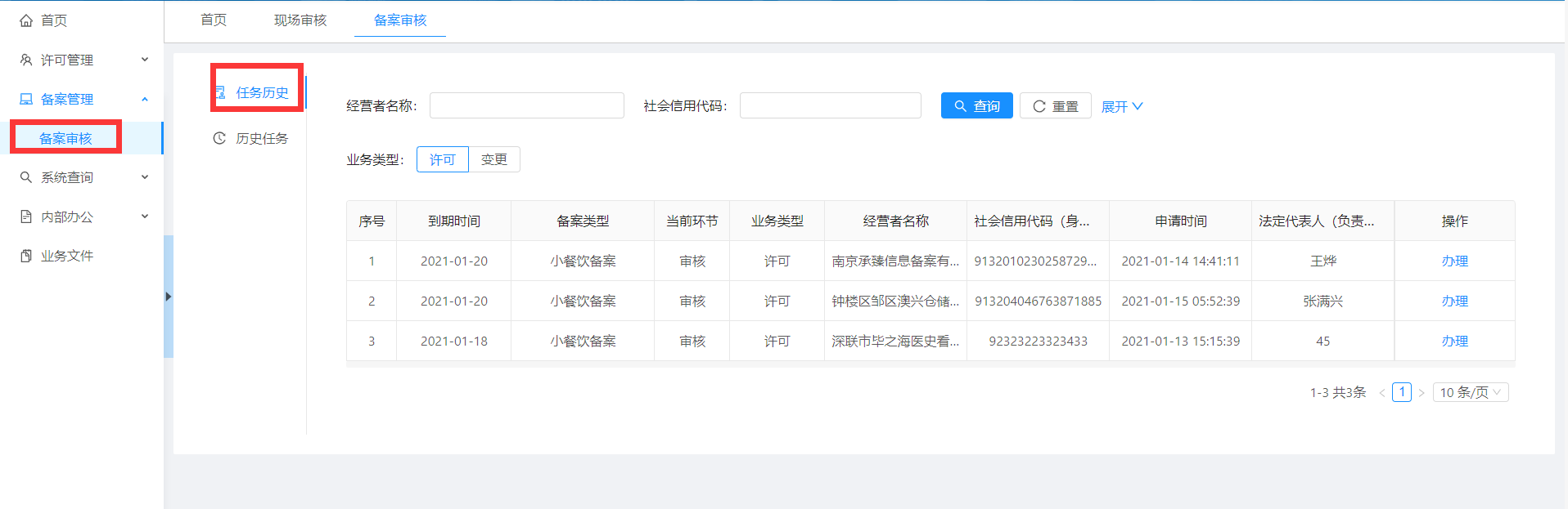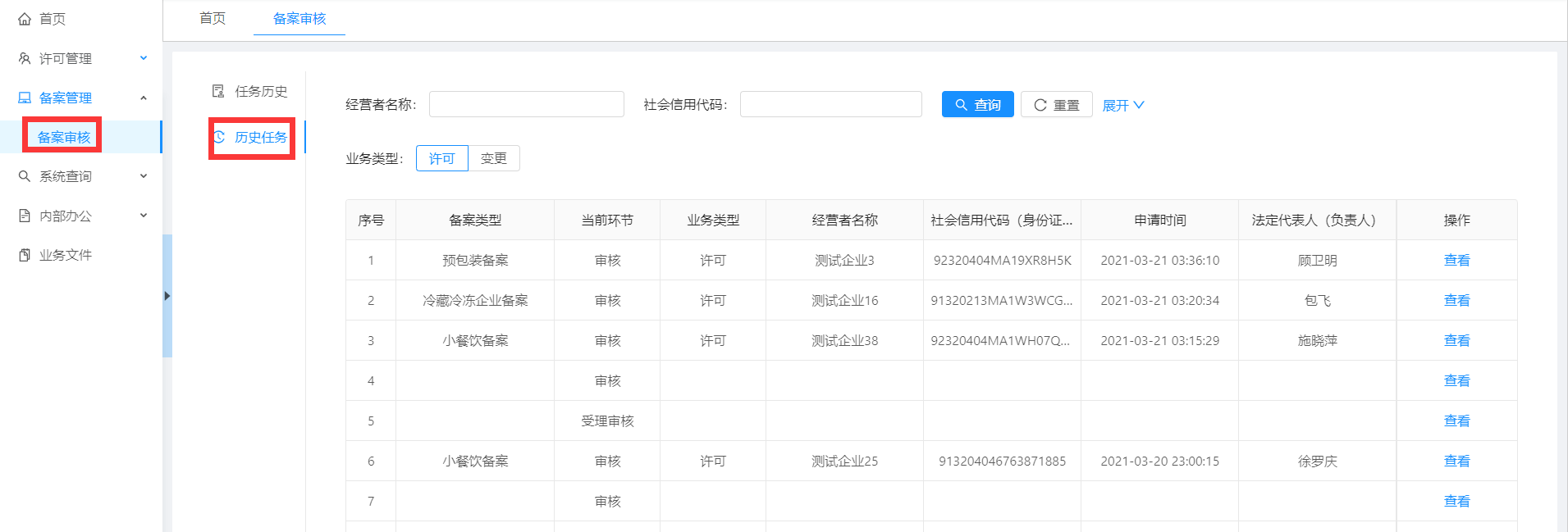 点击菜单【备案审核】-【历史任务】,可以看到所有自己审核过的备案企业信息。