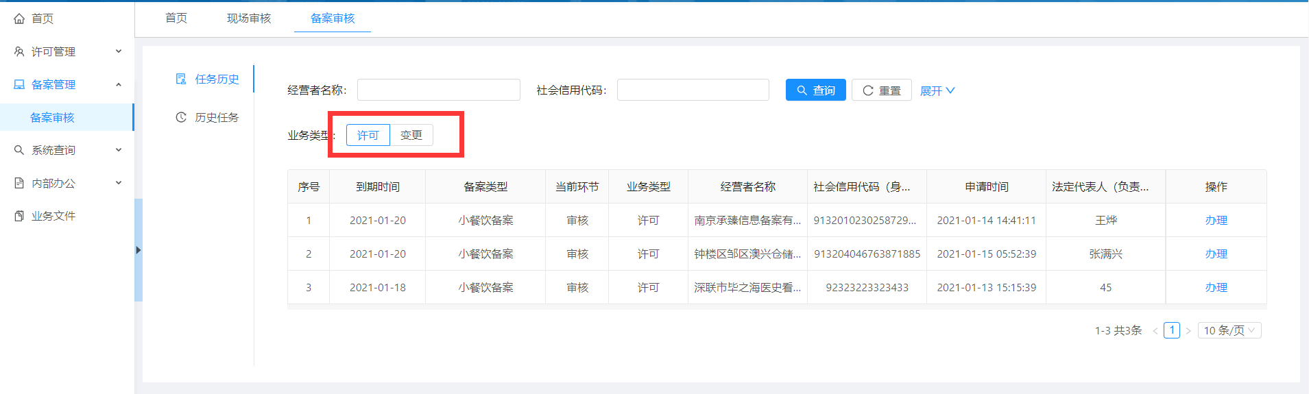 5.不同业务类型的备案申请,审核人员切换页签即可查看对应待审核信息。