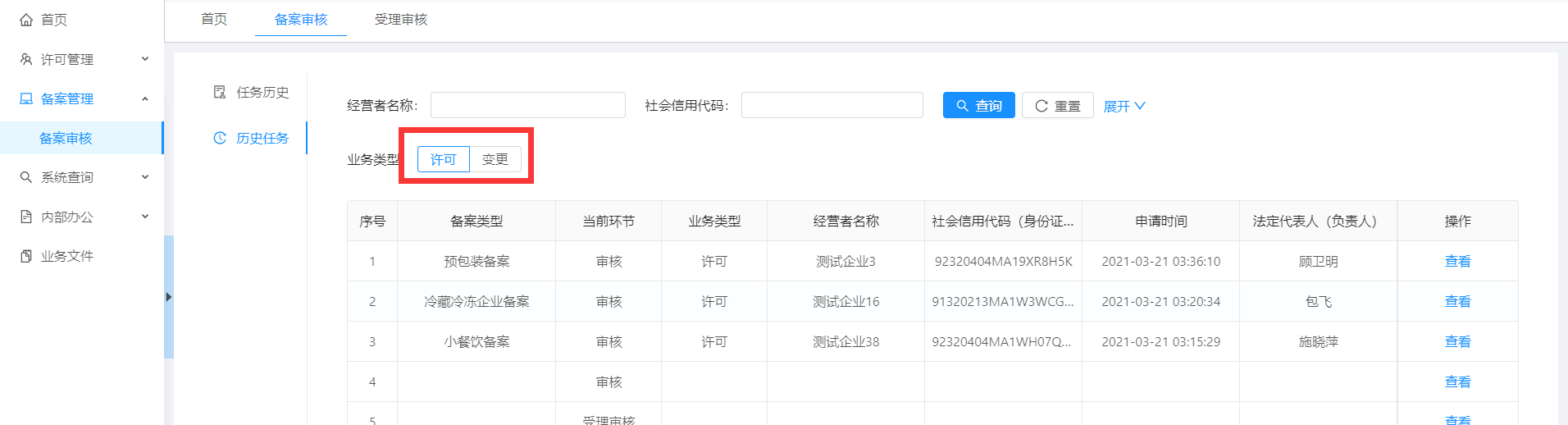 2.通过选择页签可以查看不同业务类型的备案受理审核历史记录信息。