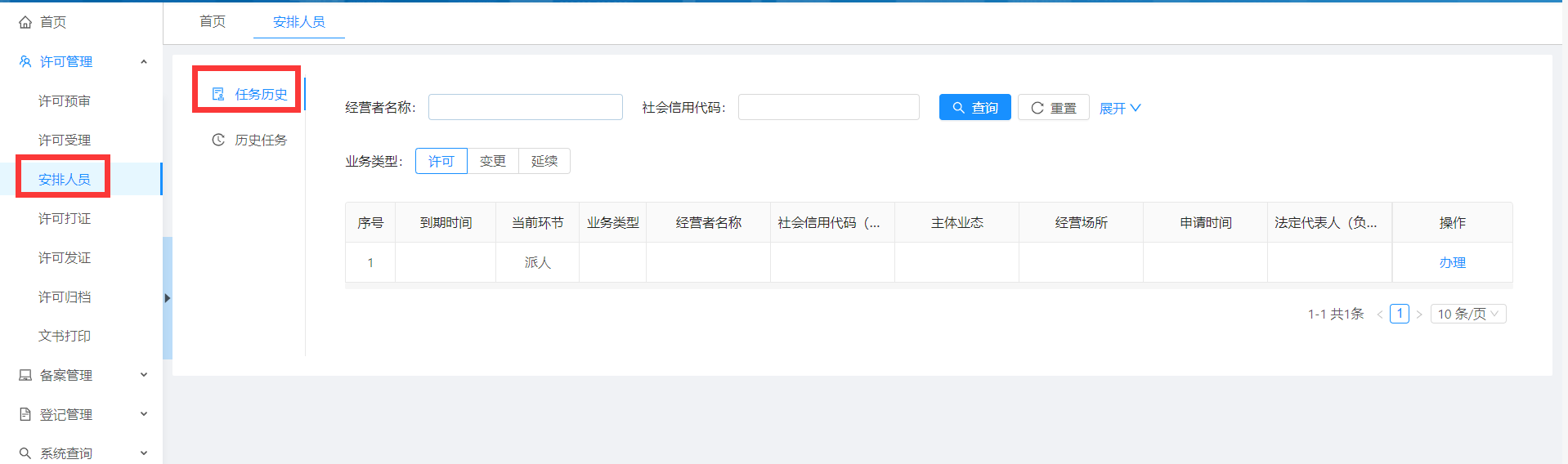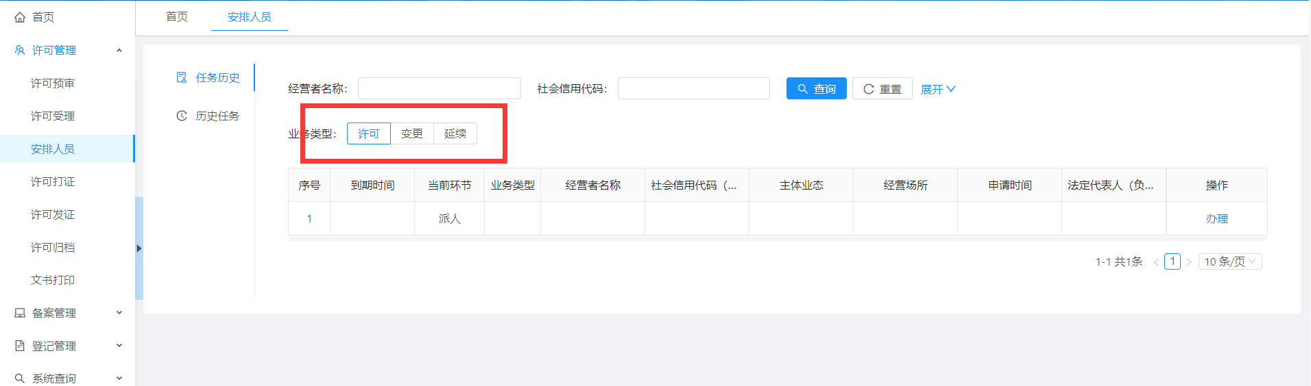 3.点击办理按钮可以对企业进行人员安排;