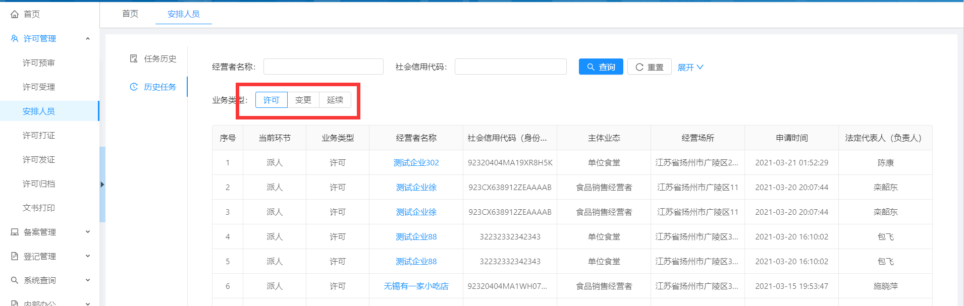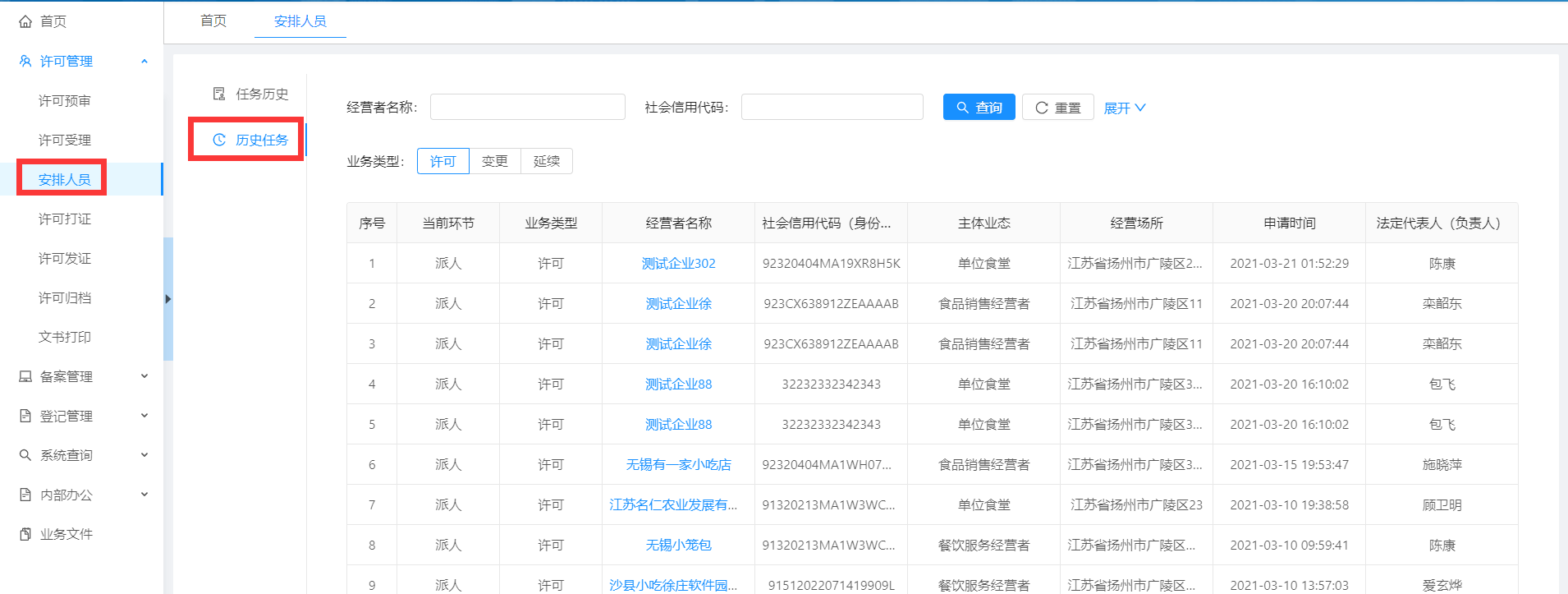 点击菜单【安排人员】-【历史任务】,可以看到所有自己安排人员过的企业信息。