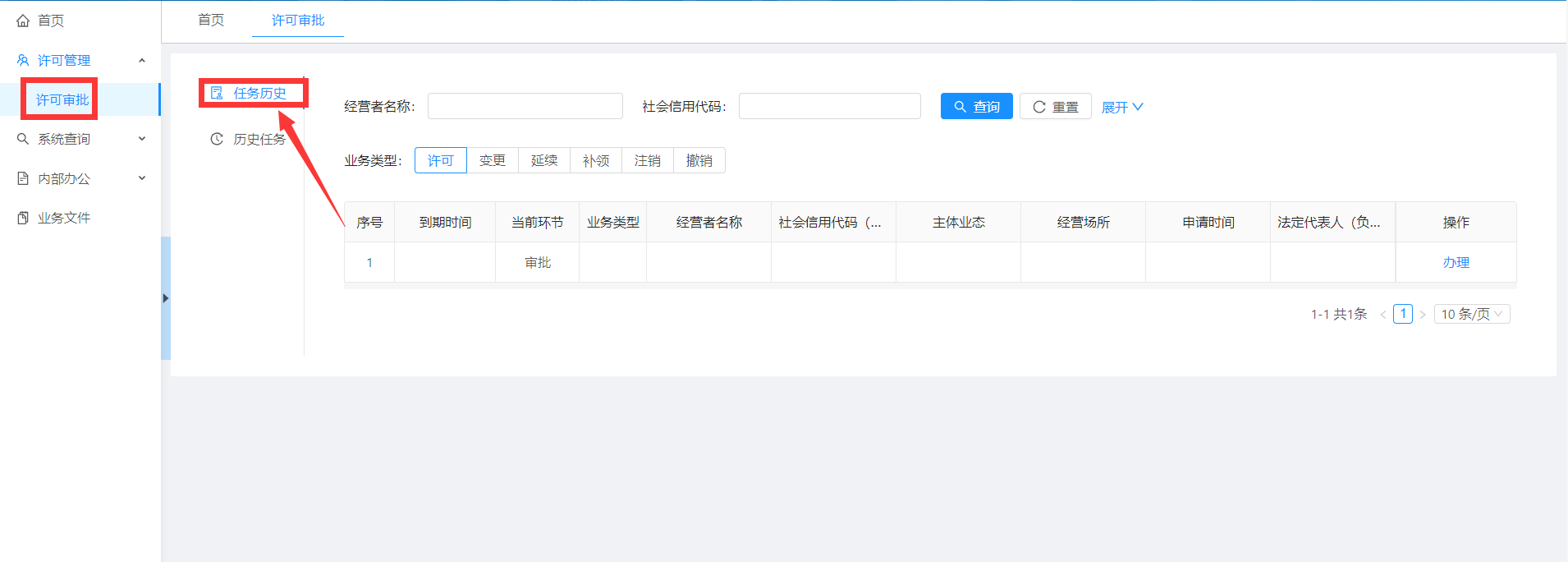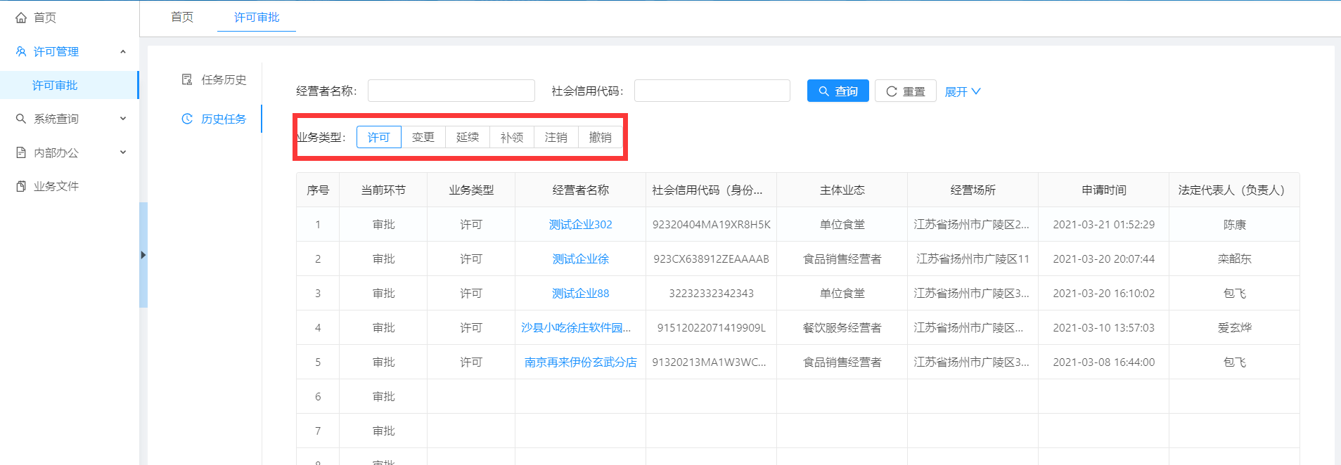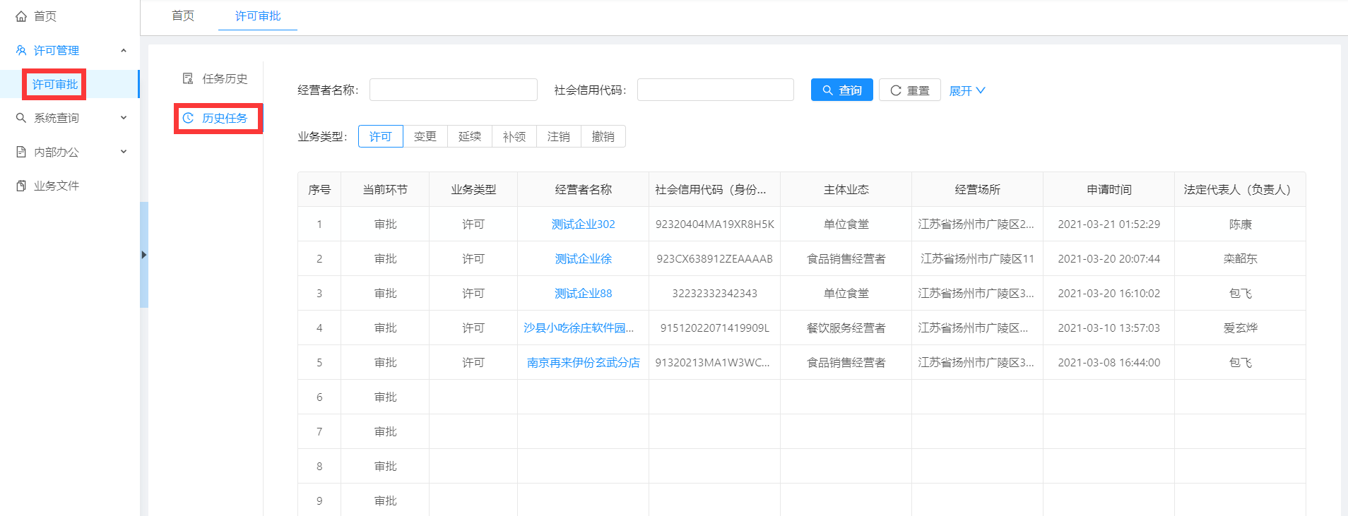点击菜单【许可审批】-【历史任务】,可以看到所有自己审批过的企业信息。