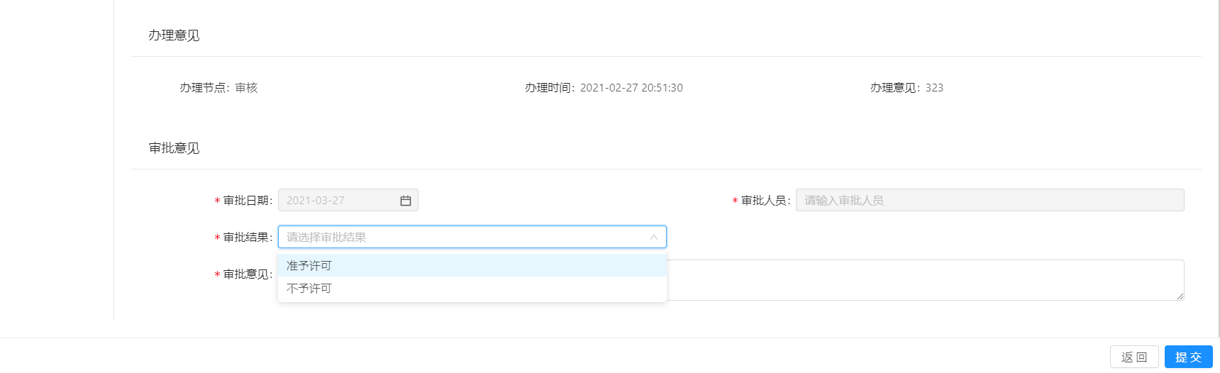 4.选择审批结果:准予许可、不予许可。若选择不予许可则不予发证,流程结束;