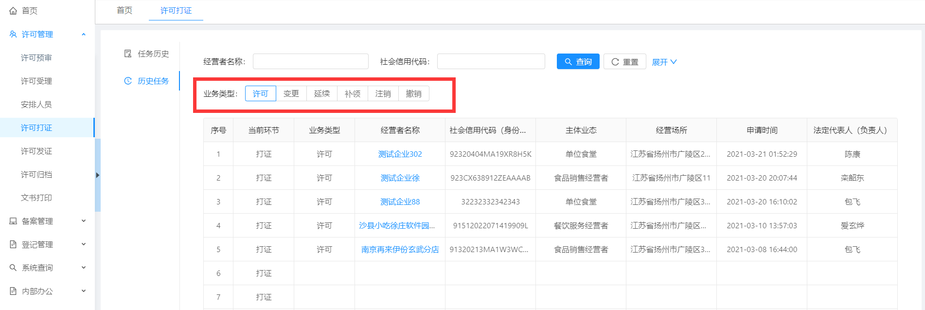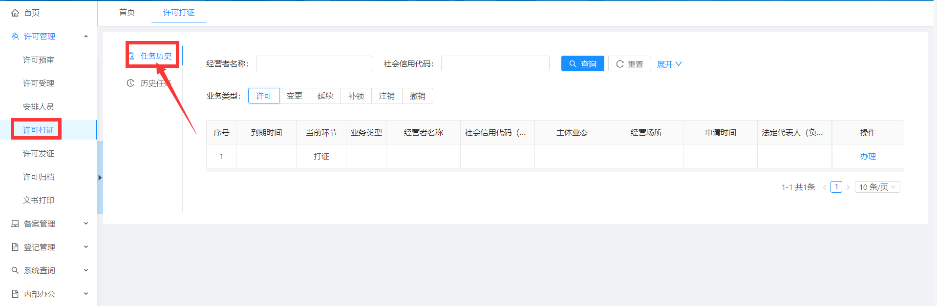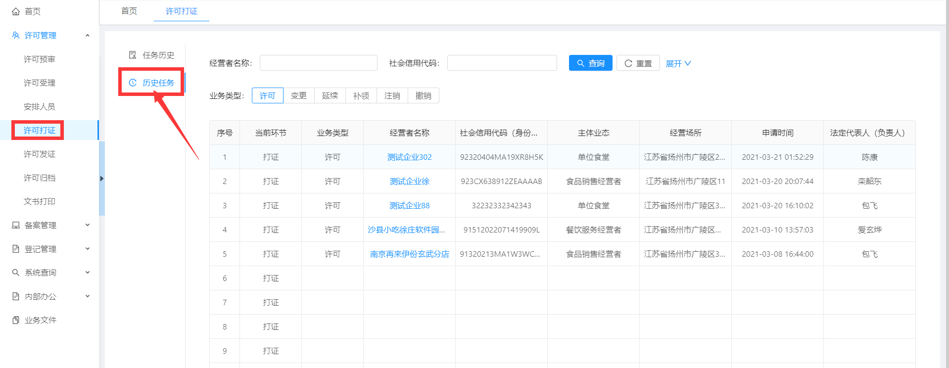 点击菜单【许可打证】-【历史任务】,可以看到所有自己打证过的企业信息。