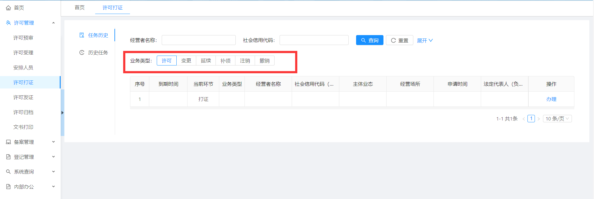 点击菜单【许可打证】-【打证待办】显示已审批通过等待打证的企业信息。