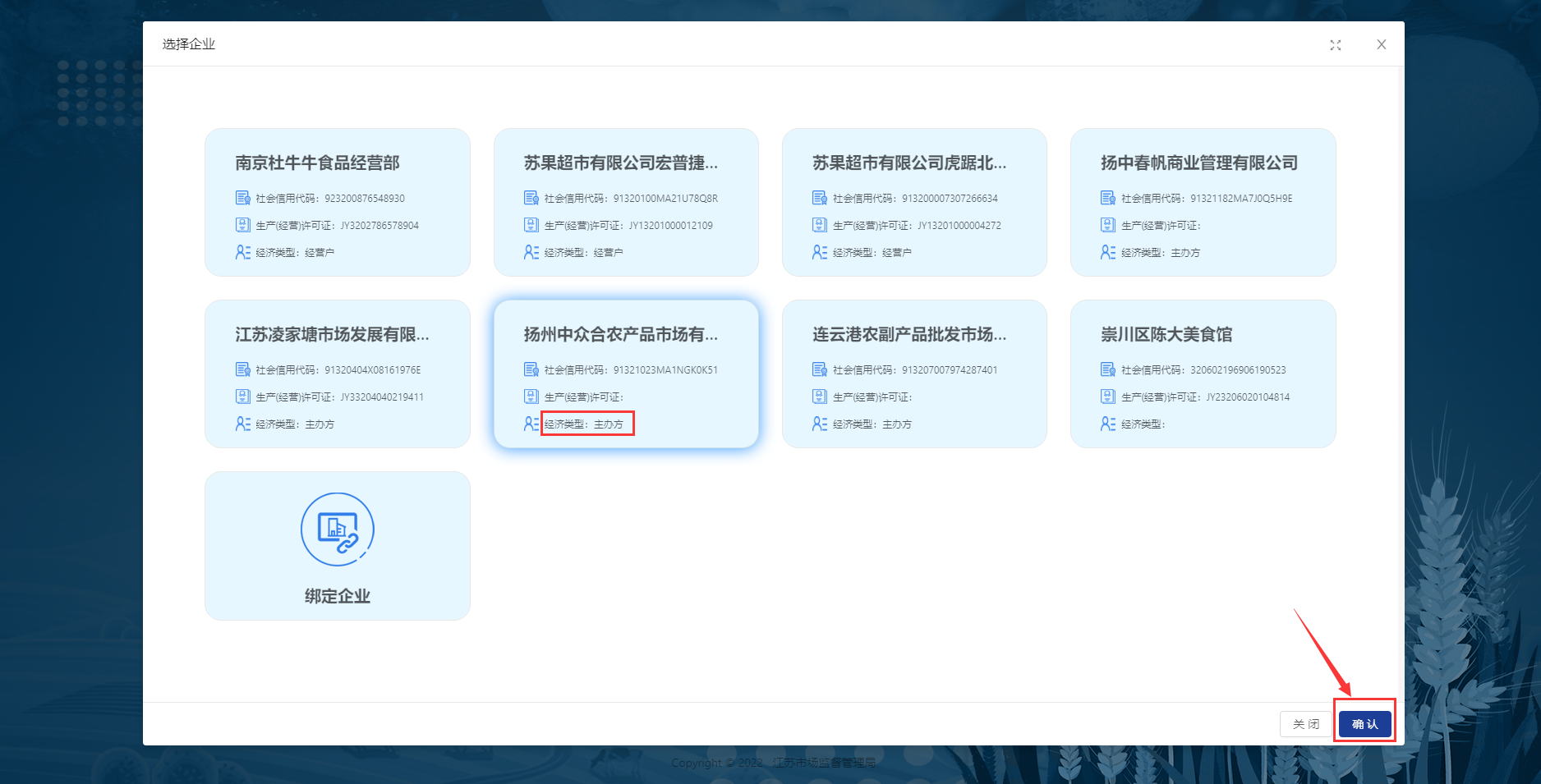 选择企业类型为【主办方】的企业,系统右下角出现【确定】按钮 ,点击【确定】按钮进入系统。