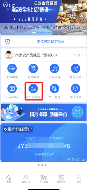 企业主体绑定成功后,可以点击进入“农产品溯源”菜单,进入农产品溯源菜单主页。(第一次进入“农产品溯源”菜单的经营户企业,需要点击授权后进入)。