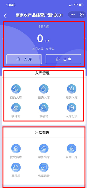 进入农产品溯源菜单页面,首页包括:当日入库数据、入库管理、出库管理、库存管理、基础信息及主体管理菜单功能。