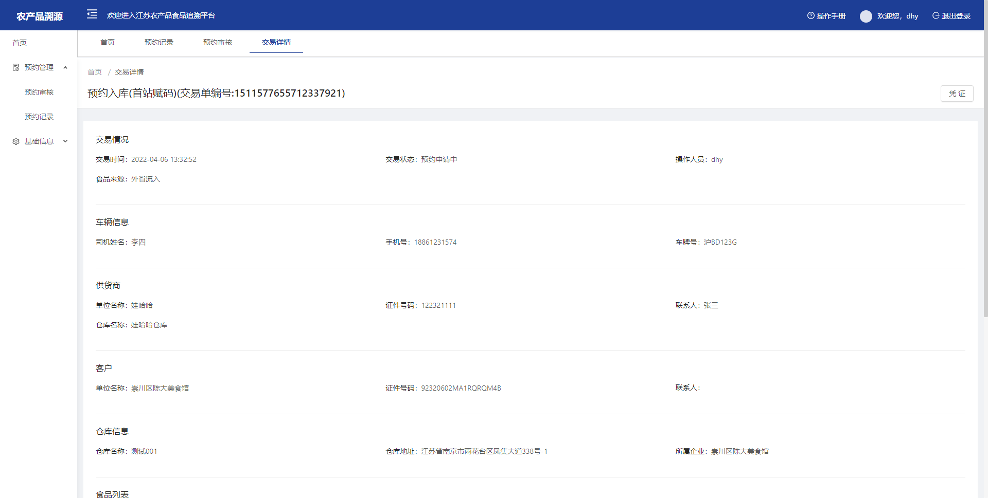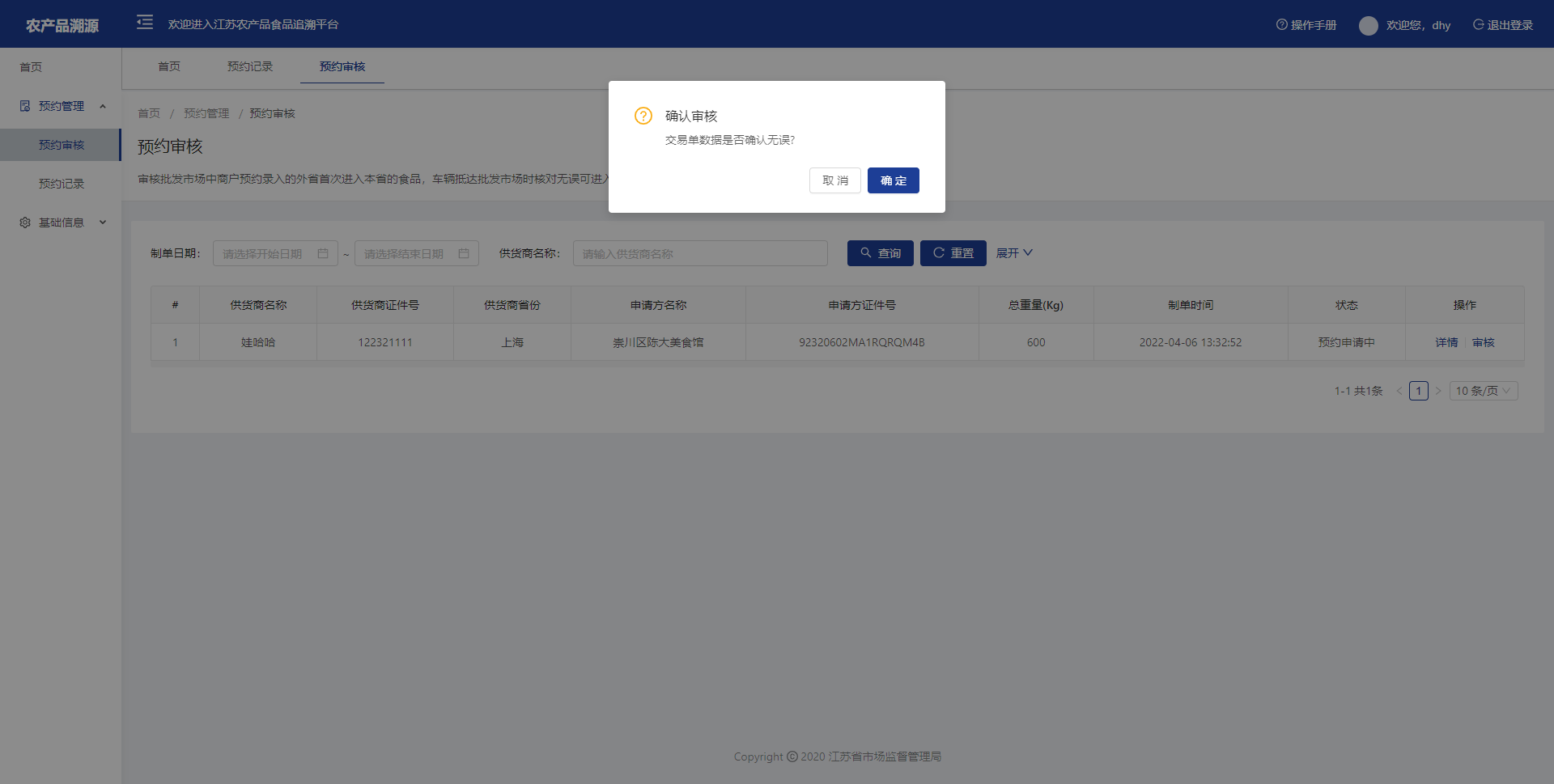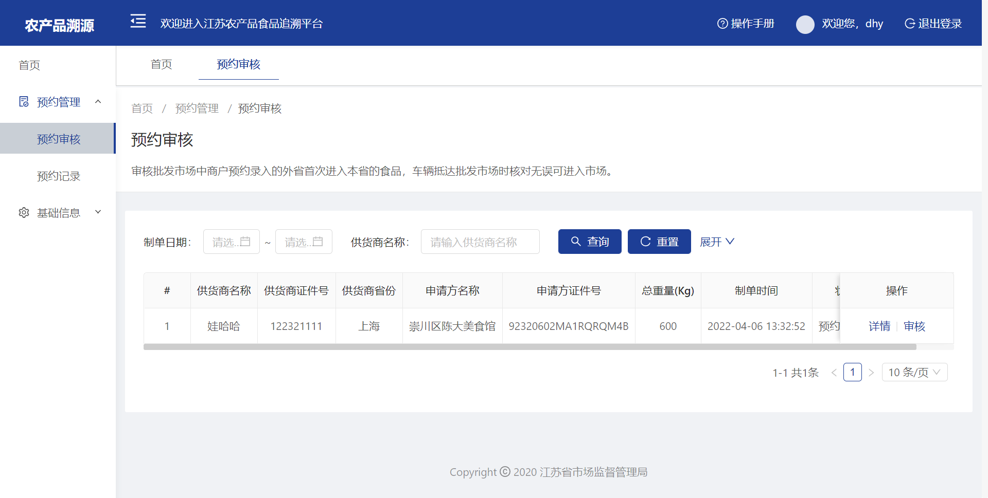 点击菜单【预约管理】-【预约审核】显示批发市场中商户预约录入的外省首次进入本省的食品的信息。