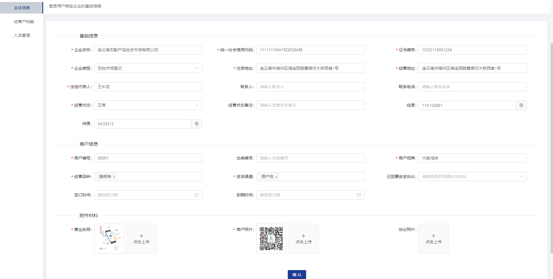 点击菜单【基础信息】-【主体信息】录入用户企业的基础信息、商户信息、附件材料(带*号的字段为必填字段)。