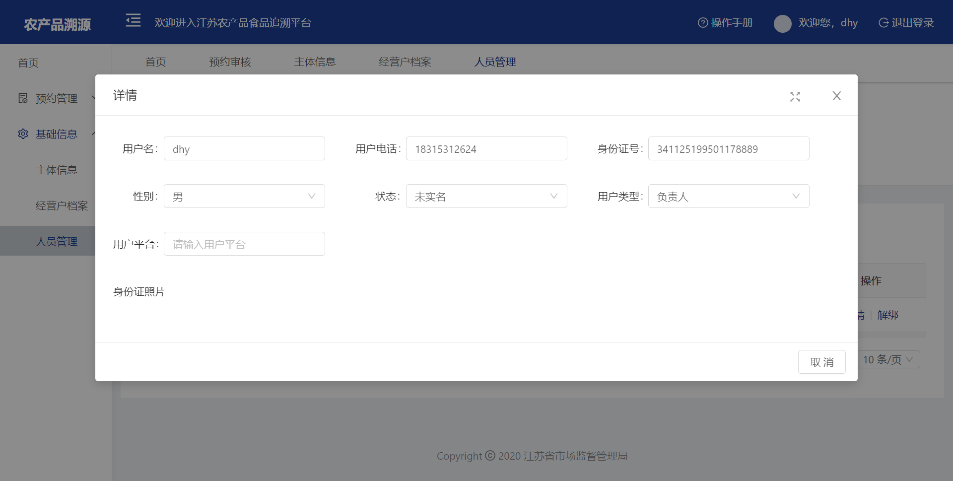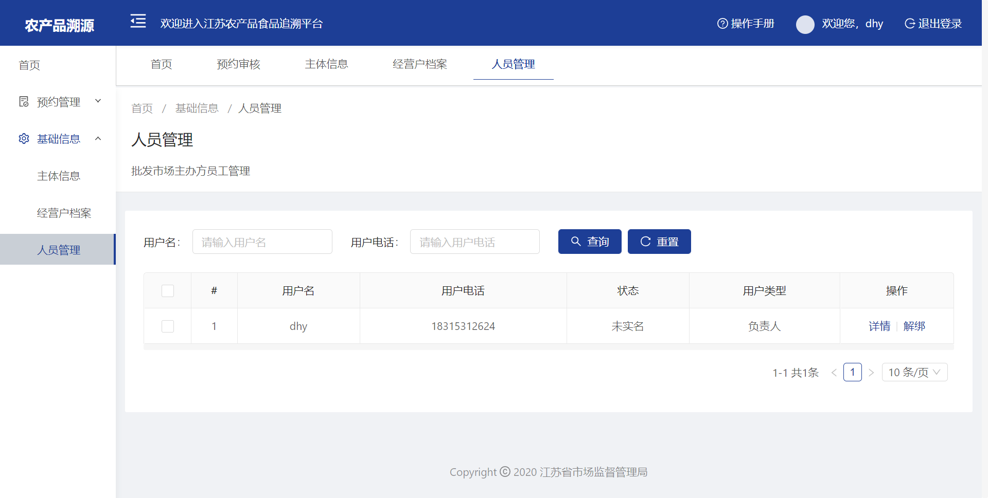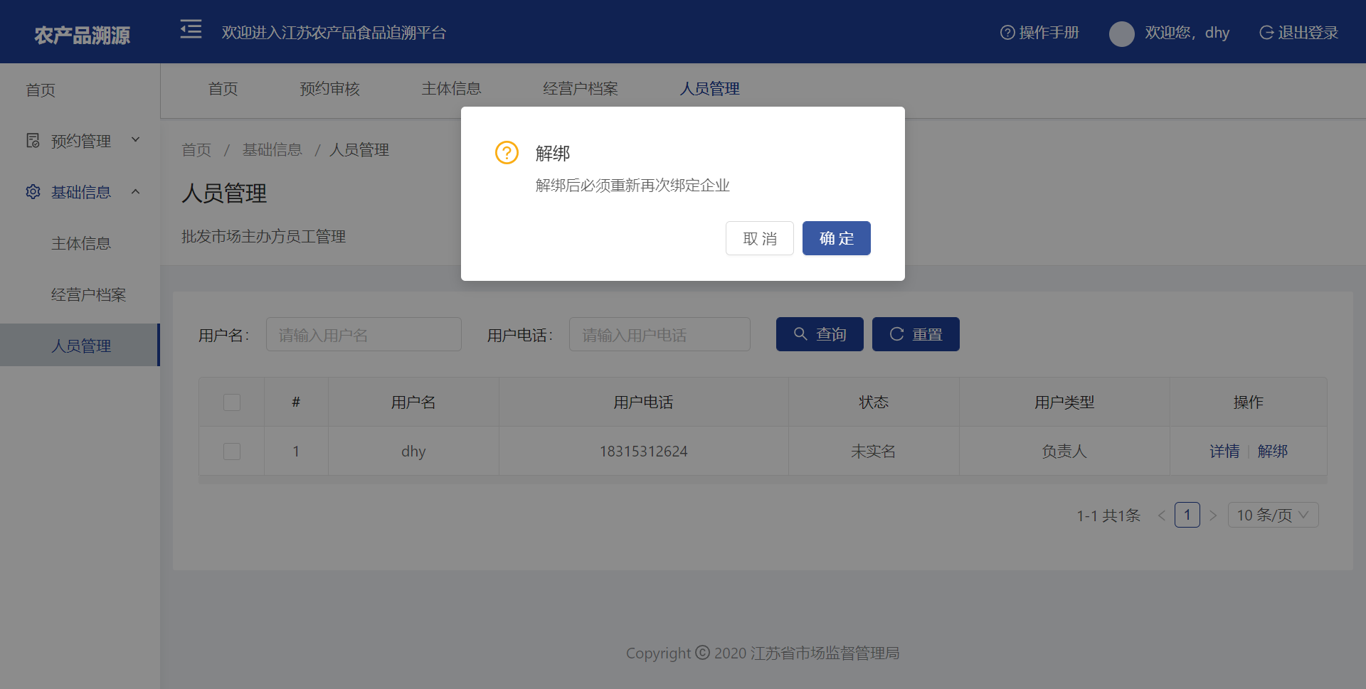 选择一条数据,点击【详情】可查看人员的详细信息,点击【解绑】可将该人员从本市场解绑去除。
