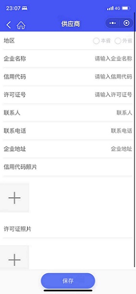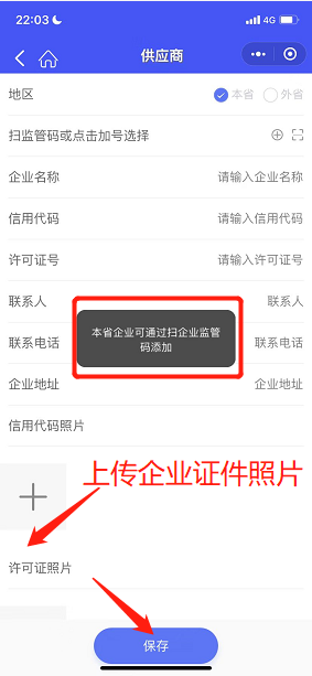 企业也可以根据页面提示自行输入企业相关信息内容,上传本省供应商的营业执照及许可证的证件信息内容确认信息无误后,进行保存操作。