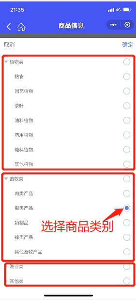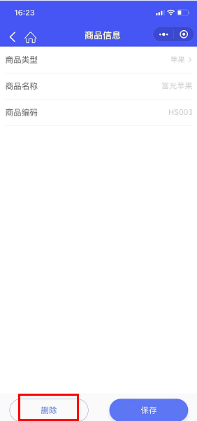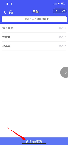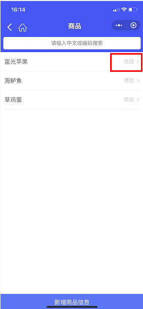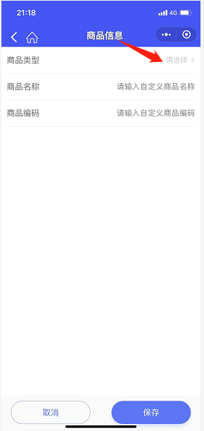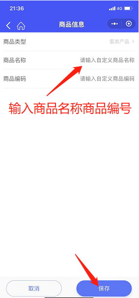1.新增商品:点击新增商品信息添加商品,进入“商品信息”页面,根据页面提示,根据类别选择商品类型,输入商品名称及商品编号,点击保存。