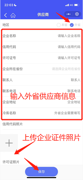 1)供应商是外省企业,地区选择:外省,输入企业名称、统一社会信用代码、许可证编号、企业所在省份、联系人、联系电话、企业地址及冷库名称,需上传外省供应商的营业执照及许可证的证件信息内容,确认信息无误后,进行保存操作。