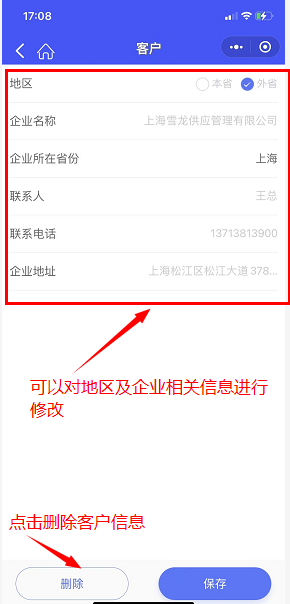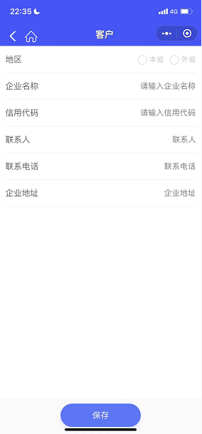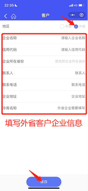 1)客户是外省企业,地区选择:外省,输入企业名称、统一社会信用代码、企业所在省份、联系人、联系电话、企业地址及冷库名称,确认信息无误后,进行保存操作。