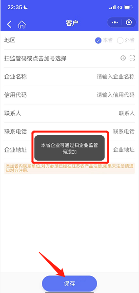 2)客户是本省企业,地区选择:本省,本省客户可以通过扫本省企业的监管二维码添加客户的企业信息,扫码识别成功,系统会自动带入客户的相关企业信息内容(建议企业通过扫码方式添加本省的客户信息)。