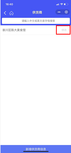 2.修改及删除供应商信息,选择一条供应商信息,点击“修改”,可以对供应商进行修改及删除操作。