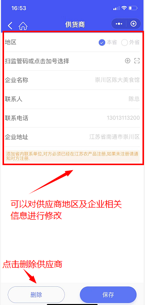 2)供应商是本省企业,地区选择:本省,可以通过扫本省企业的监管二维码添加供应商企业信息,扫码识别成功,系统会自动带入供应商的相关企业信息内容(建议企业通过扫码方式添加本省供应商信息)。