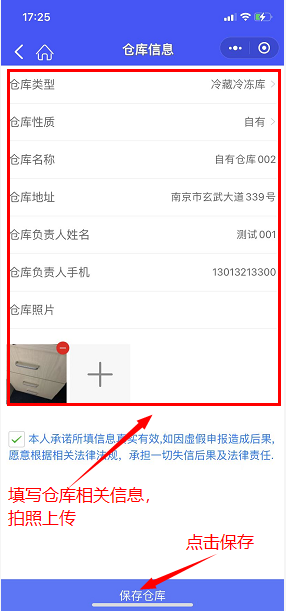 1)点击“添加仓库”,选择仓库类型、仓库性质选择:自有/租赁/委托,根据页面提示填写仓库相关信息,拍照上传后点击保存。