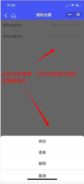 2.修改及删除仓库信息,选择一条仓库信息,可以对仓库信息进行修改及删除操作。