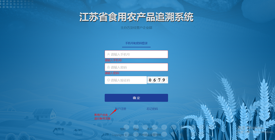 1.江苏农产品经营企业及主办方登录江苏农产品食品追溯平台电脑端https://jsll.jszwfw.gov.cn/trace/pc,点击“账户注册”进行账号注册: