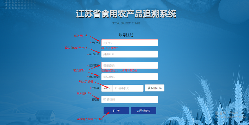 2.进入注册页面,根据页面提示输入用户名、身份证号码、登录密码及11位手机号码,获取手机验证码后,输入收到的验证码,完成注册。