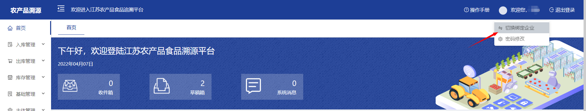 4.企业可以绑定多个主体,在企业主体菜单登录的用户名下方,选择“切换绑定企业”,通过切换主体绑定进入到不同的企业主体,选择其中一个主体即进入该企业菜单页面进行操作。