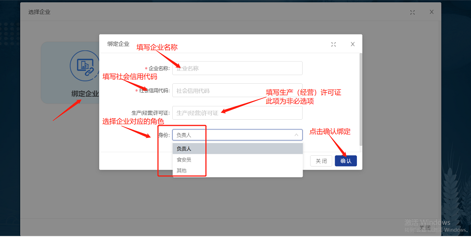 1.点击“绑定企业”进行企业绑定操作,根据页面提示输入需要绑定的企业名称、企业统一社会信用代码及生产(经营)许可证号(此项为非必选项),选择企业身份角色,点击“确认”完成绑定。