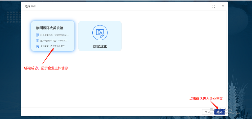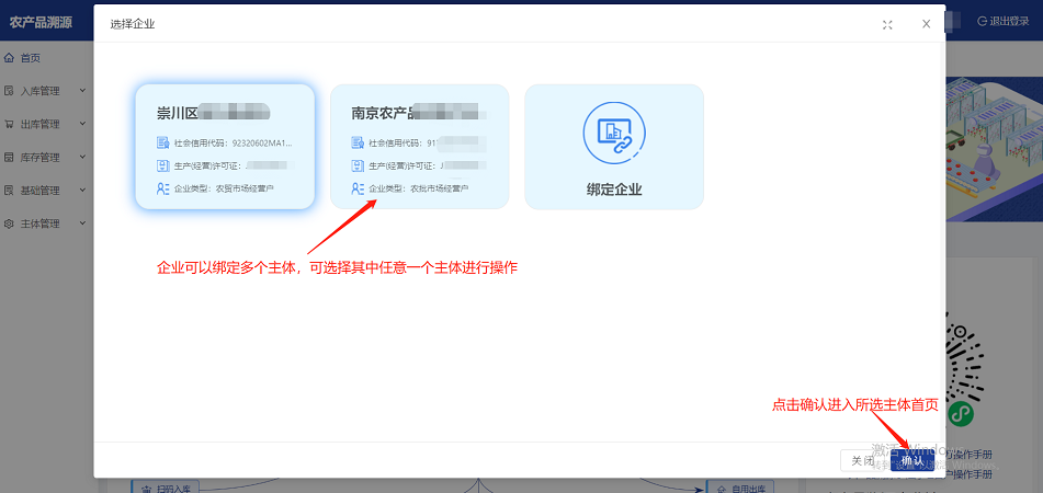 2.完成绑定后,系统显示企业主体信息,选择企业主体,点击“确认”进入企业主体首页菜单。