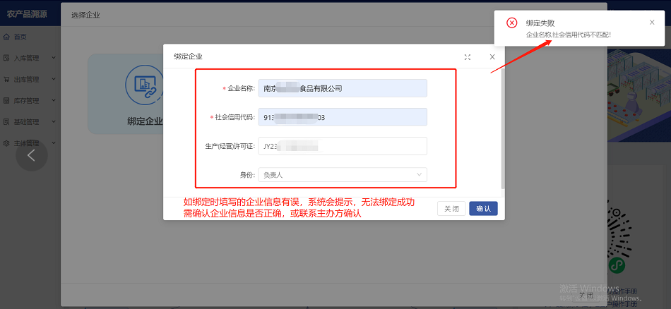 a)需先确认企业名称、统一社会信用代码及食品经营许可证(非必选项)是否输入正确,核实正确的企业信息后,重新进行绑定;