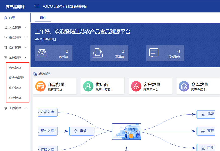 基础管理中包括:商品管理、供应商管理、客户管理及仓库管理四项功能。