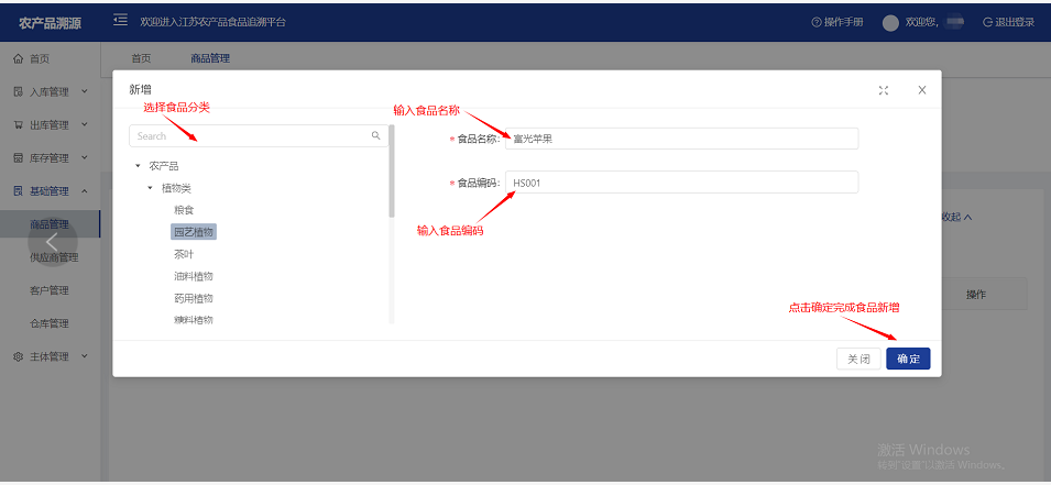 2)进入新增食品页面,选择食品分类,输入食品名称及食品编号,点击“确定”完成食品新增操作。