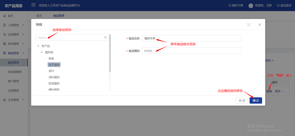 找到需要修改的食品信息,点击“编辑”进入,修改食品相关信息,点击确定保存修改。