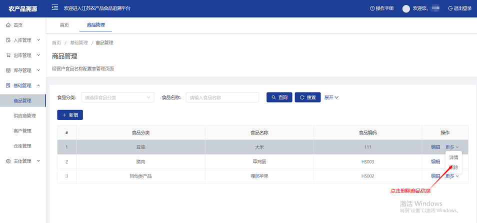 选择一条需要删除的食品信息,点击“更多”中的“删除”选项,跳出选择提示,选择“确定”删除商品信息。