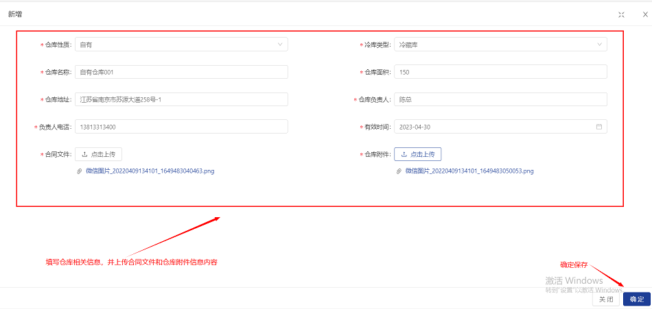 点击“新增”仓库,性质选择:委托,选择冷库类型,填写仓库名称、仓库面积、仓库地址、仓库负责人电话等相关信息,输入完成后,点击确定保存。